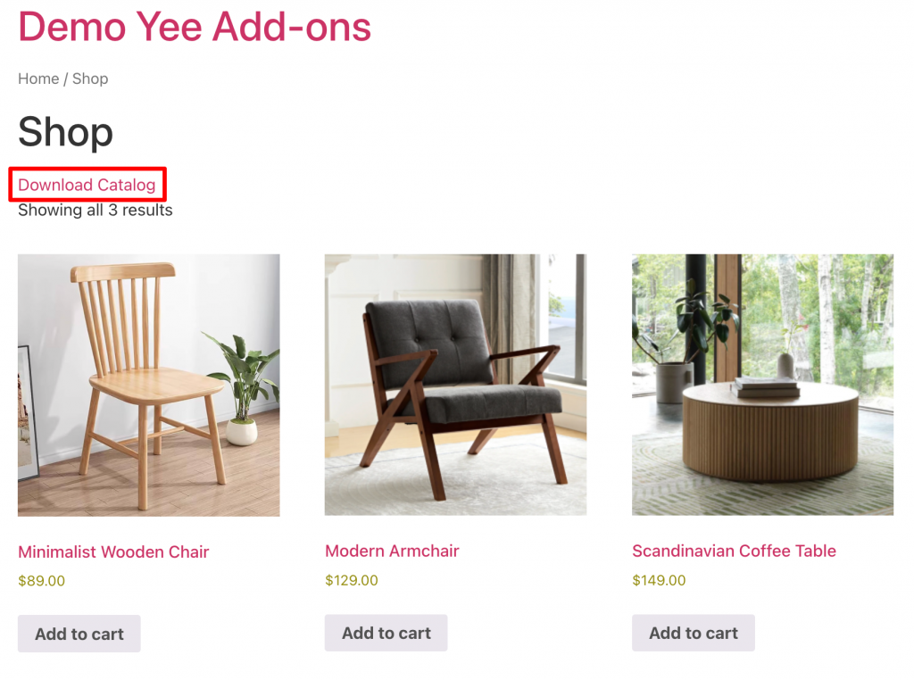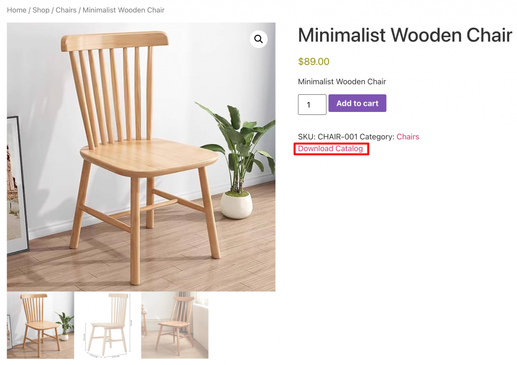 - Show on Single Product Page: Adds a “Download Catalog” button next to the “Add to Cart” button on individual product pages. This generates a 1-page PDF for that specific product.